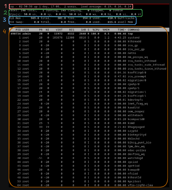 The third zone consists of two lines refering to memory usage. Line 1 reflects physical memory, classified as: total, free, used and buff/cache. Line 2 reflects mostly virtual memory, classified as: total, free, used and avail (which is physical memory)